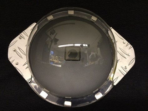 Da die Acryl Halbkugel in sich sehr steif ist, ist eine rundum Klemmung nicht nötig (dachte ich zunächst). Wichtig ist allerdings, dass die Klemmkräfte die von den Klemmblechen erzeugt werden, nicht verkantet auf den Acryl Kragen drücken. Das könnte sonst zu Spannungen in der Halbkugel führen und letztendlich zum Bruch des Dome.